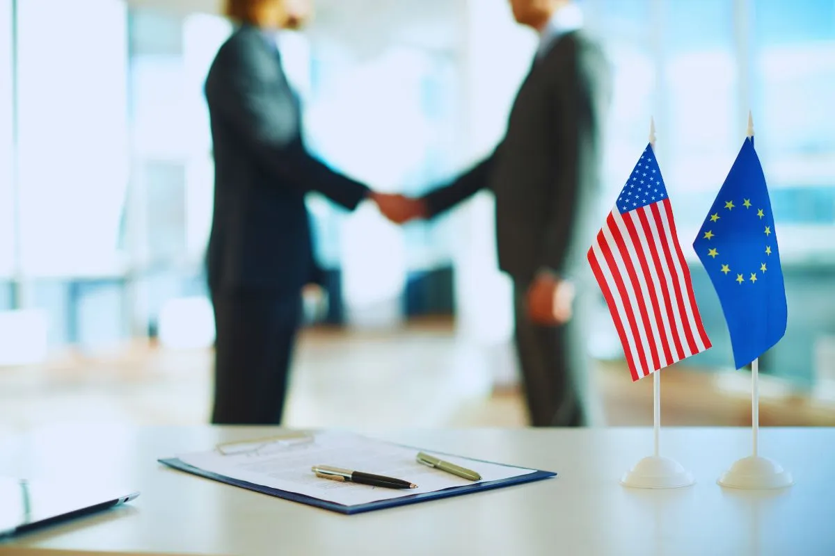 Representantes dos Estados Unidos e União Europeia apertando as mãos com ba...
